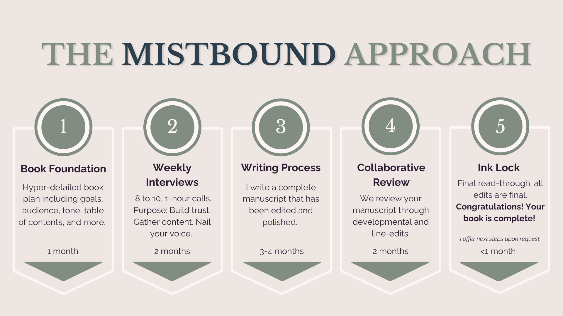 I ghostwrite MEMOIRS and PRESCRIPTIVE NONFICTION for founders, business leaders, spiritual leaders, and purpose-driven individuals. People who know they have unique ideas and stories to share with the world, but need some help getting it on the page in a way that’s clear, powerful, and true to their voice.